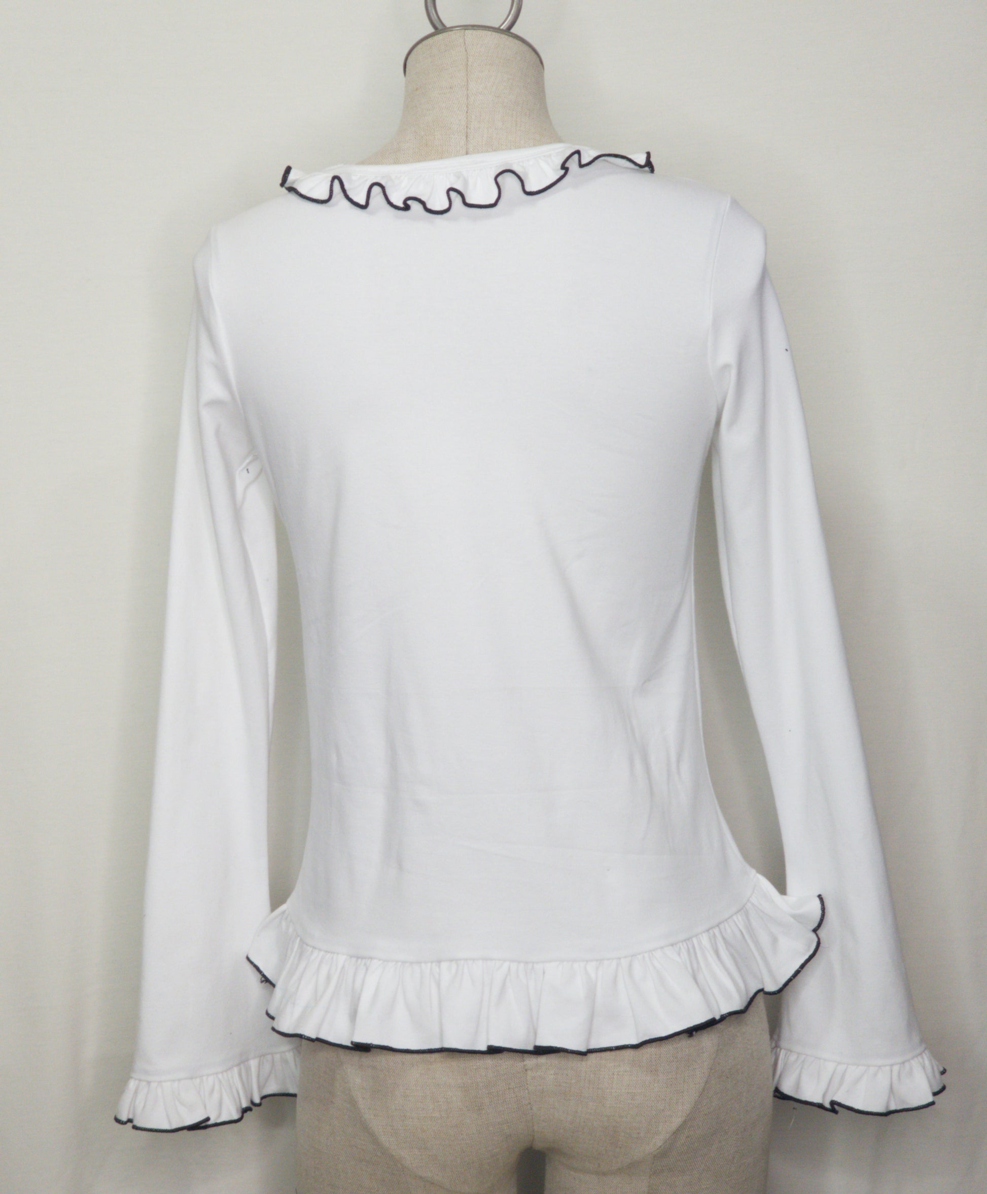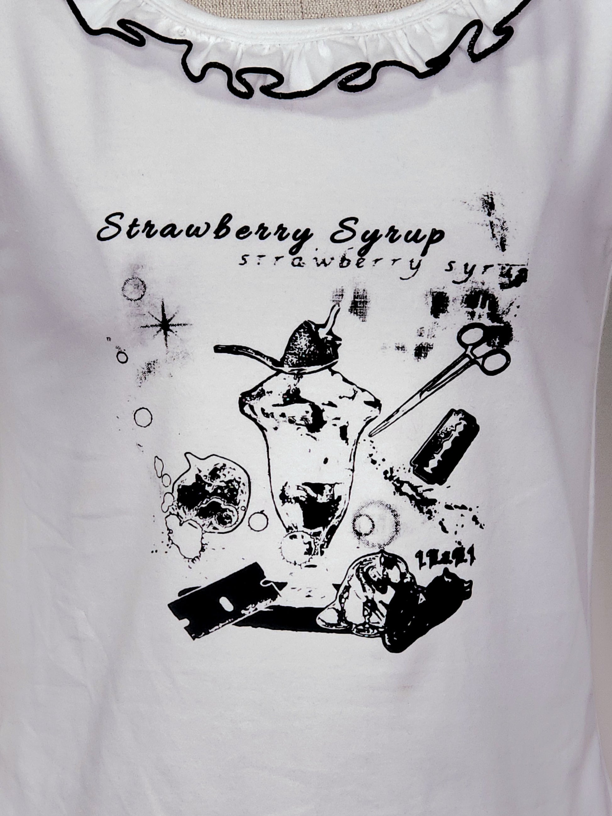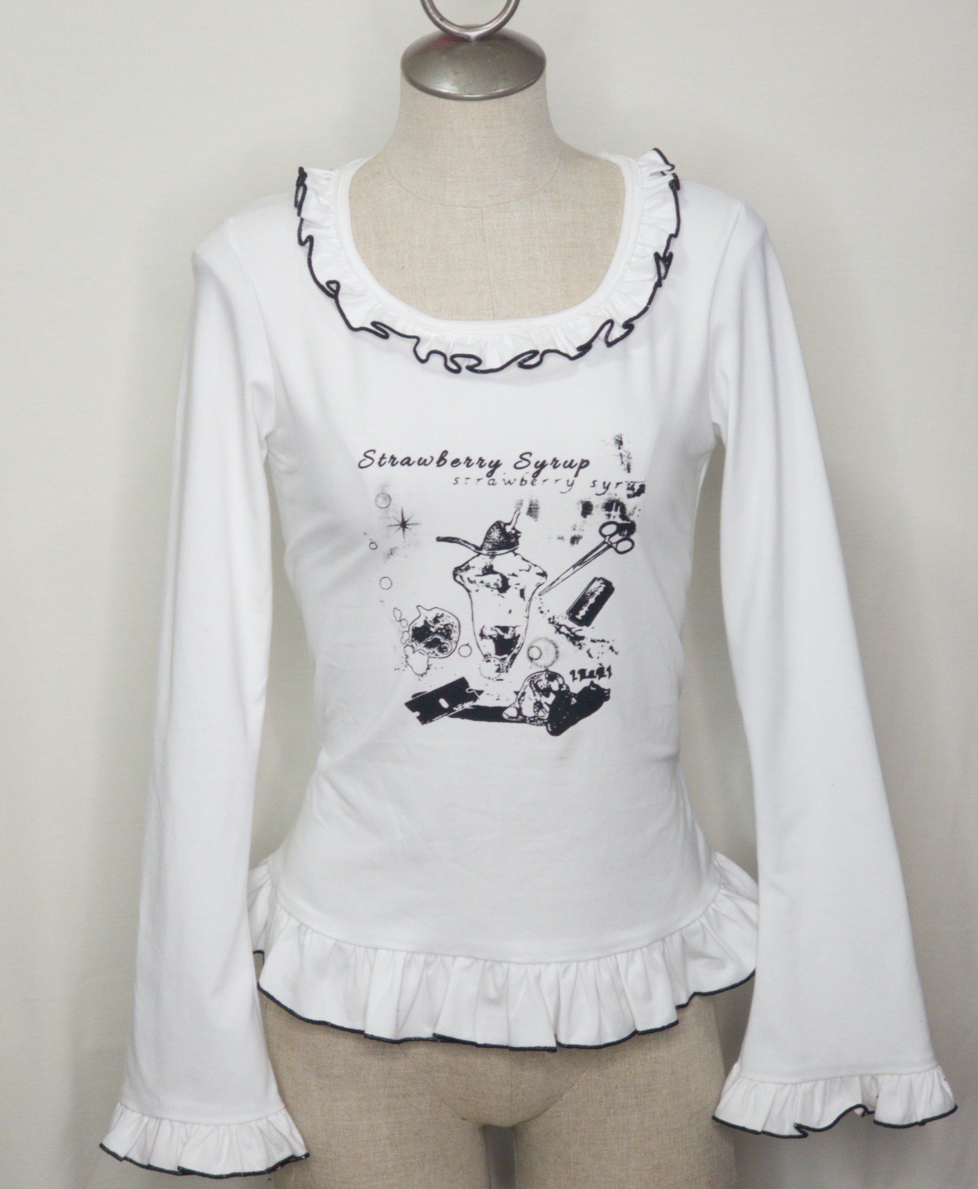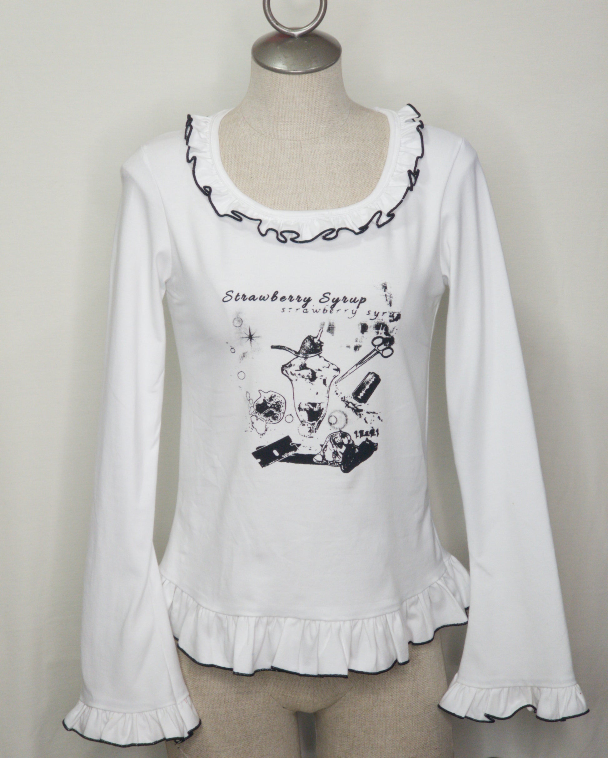 soft white cotton longsleeve cutsew with black edged ruffles and strawberry syrup print in black